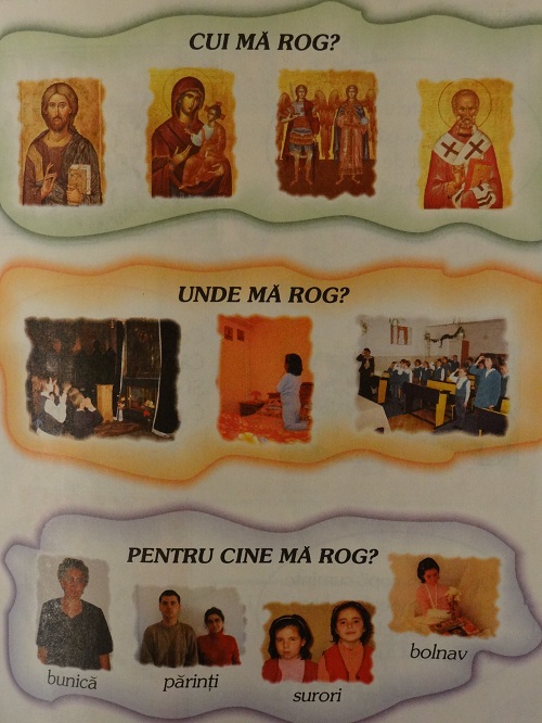 Referitor la educația religioasă, cred că biserica mizează pe convertirea copiilor, fiindcă cei mici nu posedă un aparat critic pe măsura aberațiilor impuse chiar de sistemul de învățământ actual. Mă refer la orele de religie. Atașez câteva imagini „grăitoare” din manualul de religie pentru clasa întâi. Anul Domnului 2013: